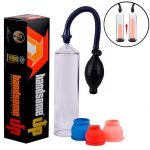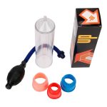 É uma bomba peniana manual com pêra para inflar, botão de descompressão rápida e 3 anéis da base em elastômero, à prova de água.